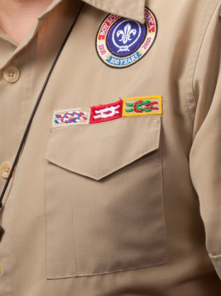The Merit Badge Sash is not a part of the uniform itself, but it’s often worn over the uniform at a Court of Honor. The Merit Badges should be sewn on the front of the sash as they are earned in neat, even rows of three. Other patches can be sewn on the back of the sash, as long as they are not previously held Badges of Rank or Badges of Office! The image here is not typical by any means. Most scouts have one merit badge sash with just a few.