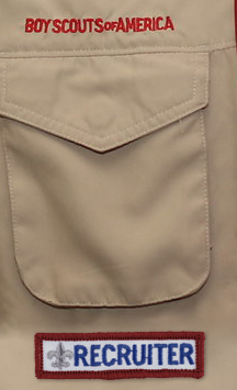 This spot of reserved for the Recruiter Patch. Recruiter Patches are given to Scouts that bring another person to join Scouting! The patch is worn centered directly below the right pocket.